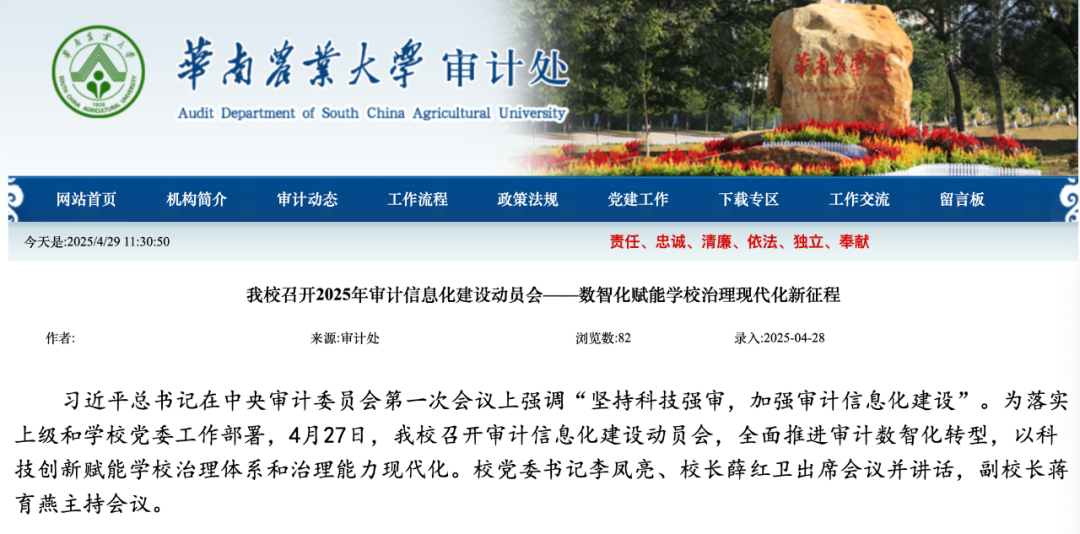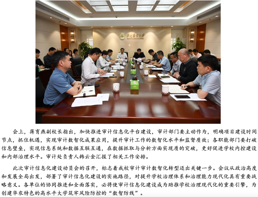 在數(shù)字化轉(zhuǎn)型浪潮中,高校治理能力提升成為“雙一流”建設(shè)的關(guān)鍵突破口,而審計(jì)信息化建設(shè)則是高校“雙一流”建設(shè)的堅(jiān)實(shí)保障。以廣東省教育廳《關(guān)于認(rèn)真做好2025年教育審計(jì)工作的通知》相關(guān)要求為背景,華南農(nóng)業(yè)大學(xué)審計(jì)處積極調(diào)研并開(kāi)展審計(jì)信息化建設(shè),與我司「北京審友數(shù)治科技有限公司」簽約合作,計(jì)劃構(gòu)建審計(jì)管理、在線作業(yè)、數(shù)據(jù)分析、整改跟蹤、工程審計(jì)、遠(yuǎn)程協(xié)同、決策支持等模塊,助力華南農(nóng)大打造高校審計(jì)信息化標(biāo)桿。