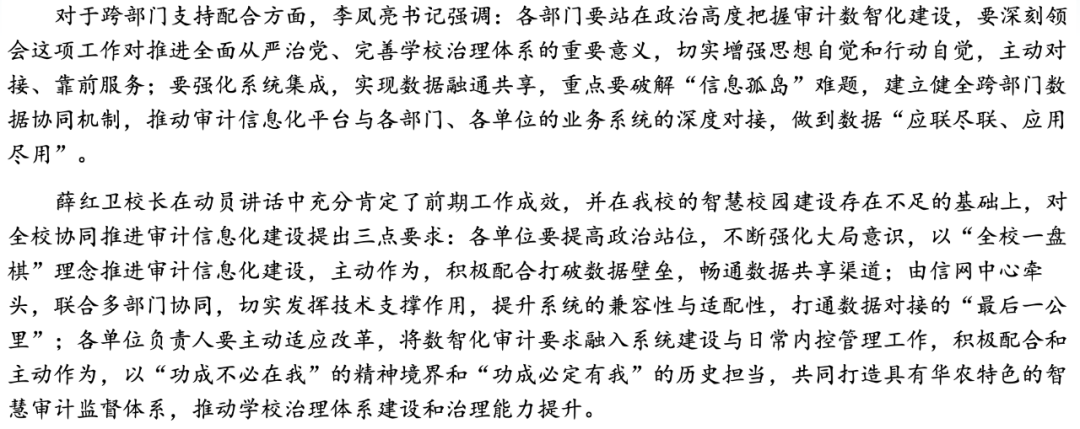 校黨委書(shū)記李鳳亮、校長(zhǎng)薛紅衛(wèi)出席會(huì)議并講話,副校長(zhǎng)蔣育燕主持會(huì)議。審友數(shù)治代表有幸受邀參會(huì),向20余位審計(jì)信息化建設(shè)項(xiàng)目相關(guān)單位處長(zhǎng)學(xué)習(xí),共同探討數(shù)智化賦能學(xué)校治理現(xiàn)代化建設(shè)。